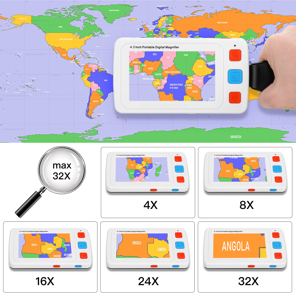 IPS DISPLAY - This portable video magnifier have 4.3” IPS screen, produce realistic colors that don’t change when you view from the side.Magnifying 4x-32x adjustable zoom makes you or your family reading easier.Enables reading quickly and complete correct, allowing the time saved to be used on the daily life.