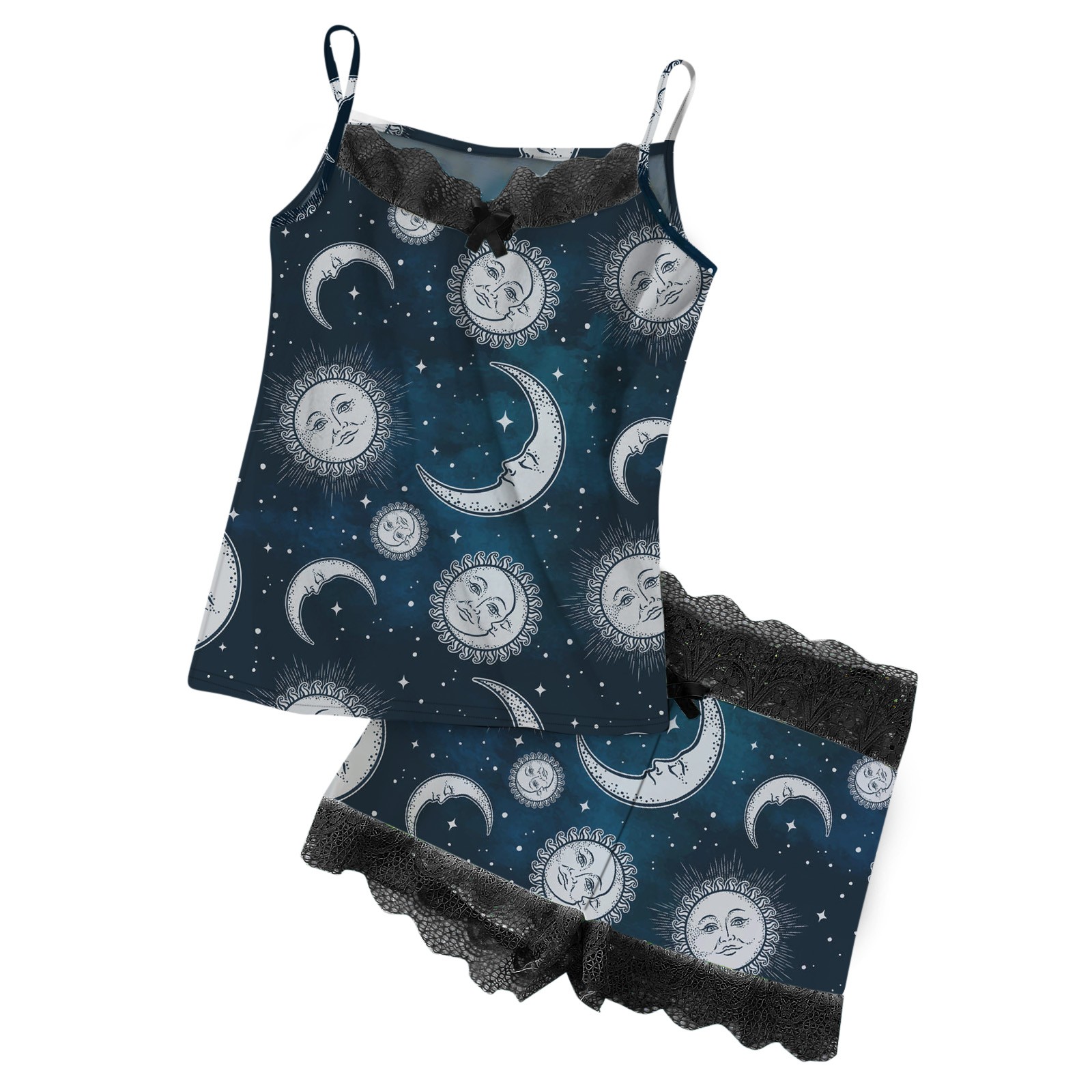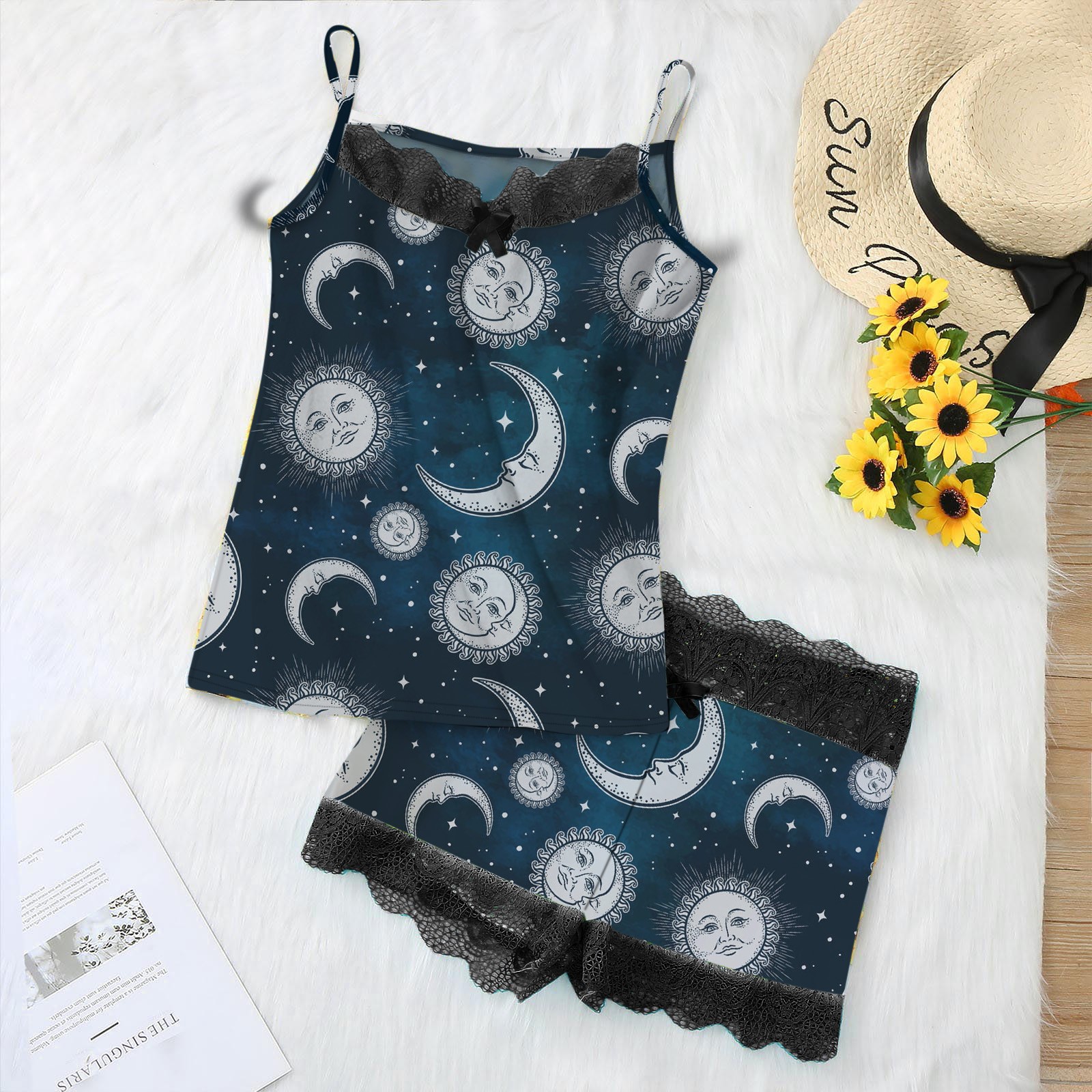Женская модная повседневная одежда для отдыха из двух частей с кружевным принтом; Брюки на бретельках и блузка