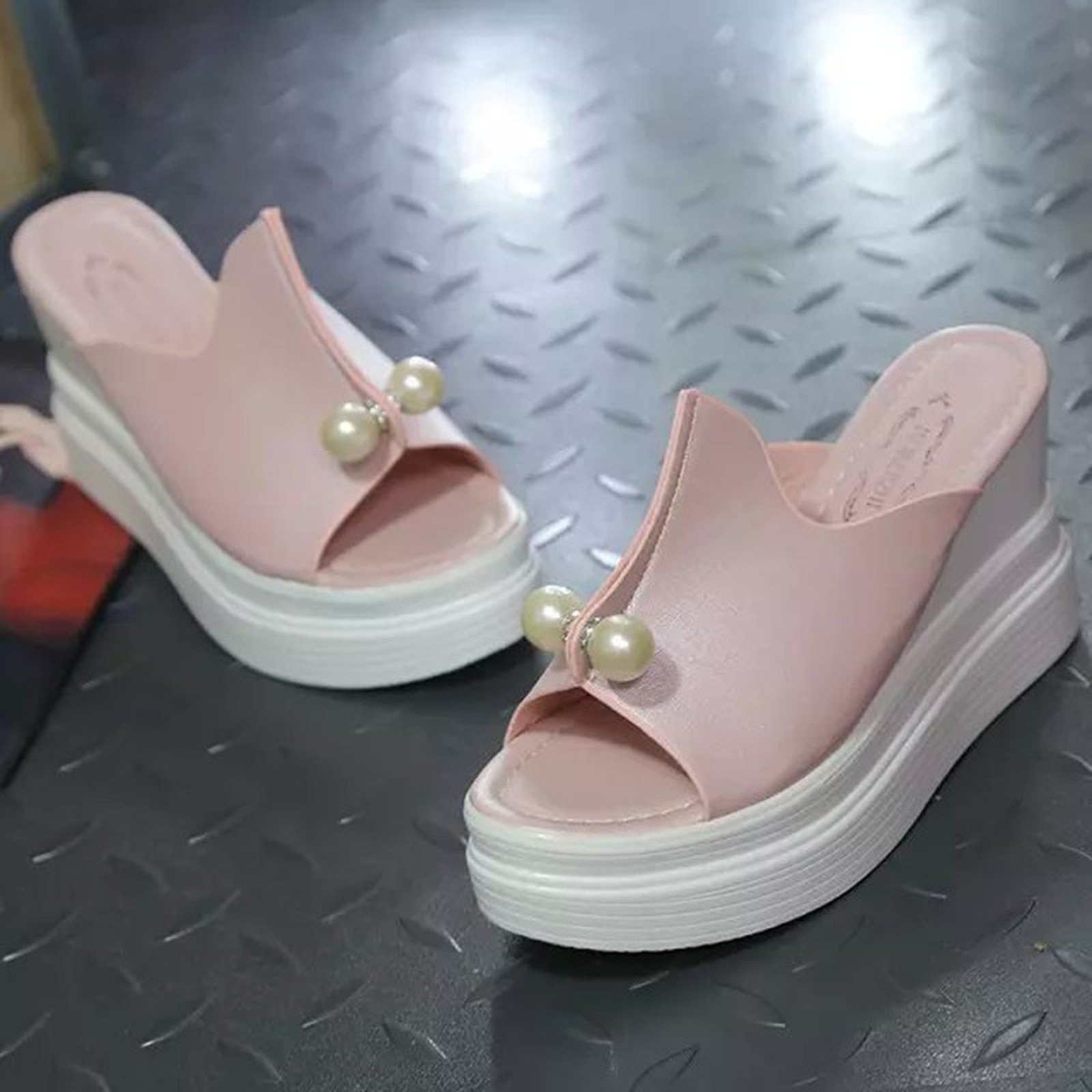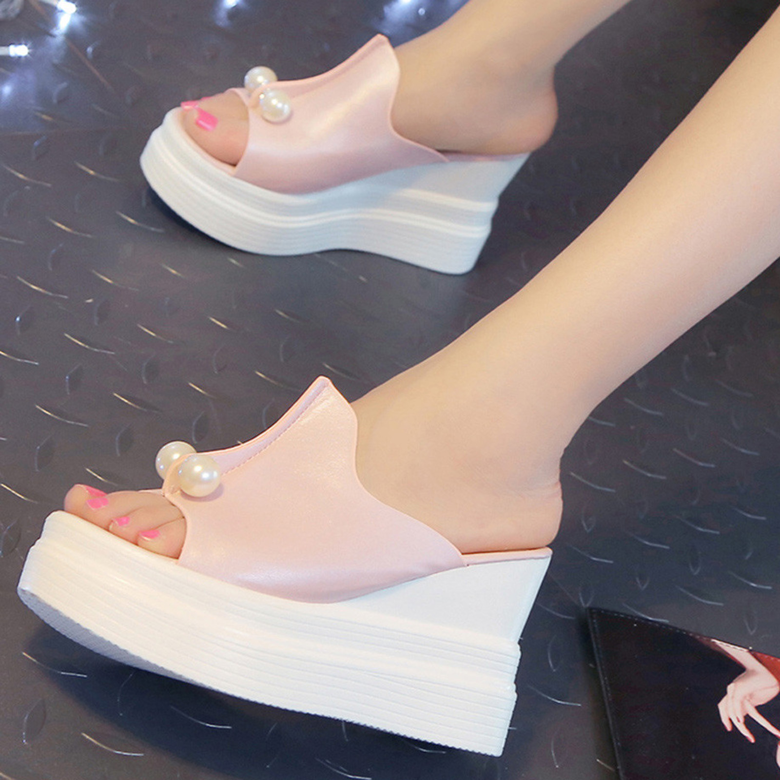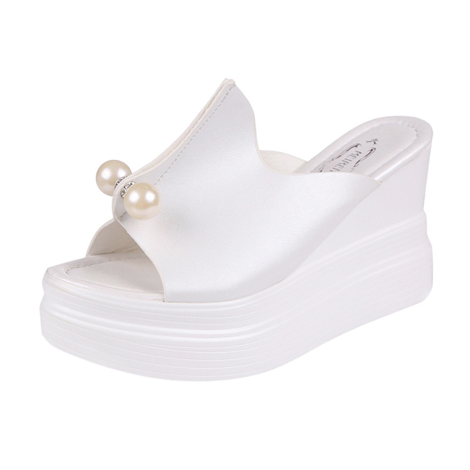Женские шлепанцы; Однотонные Водонепроницаемые босоножки на танкетке с толстой подошвой и жемчугом