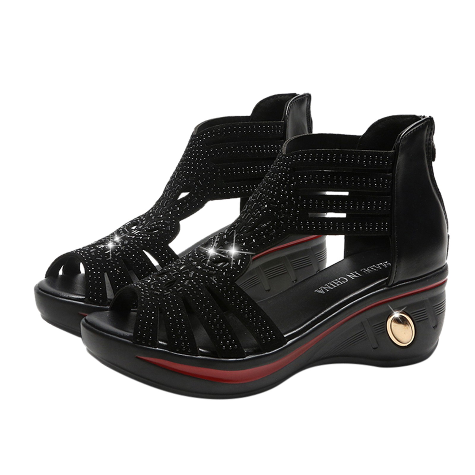 [Характеристики: круглый носок, Плетеный ремешок, танкетка, стразы, эластичный ремешок для удобного надевания и снятия, нескользящая резиновая подошва.