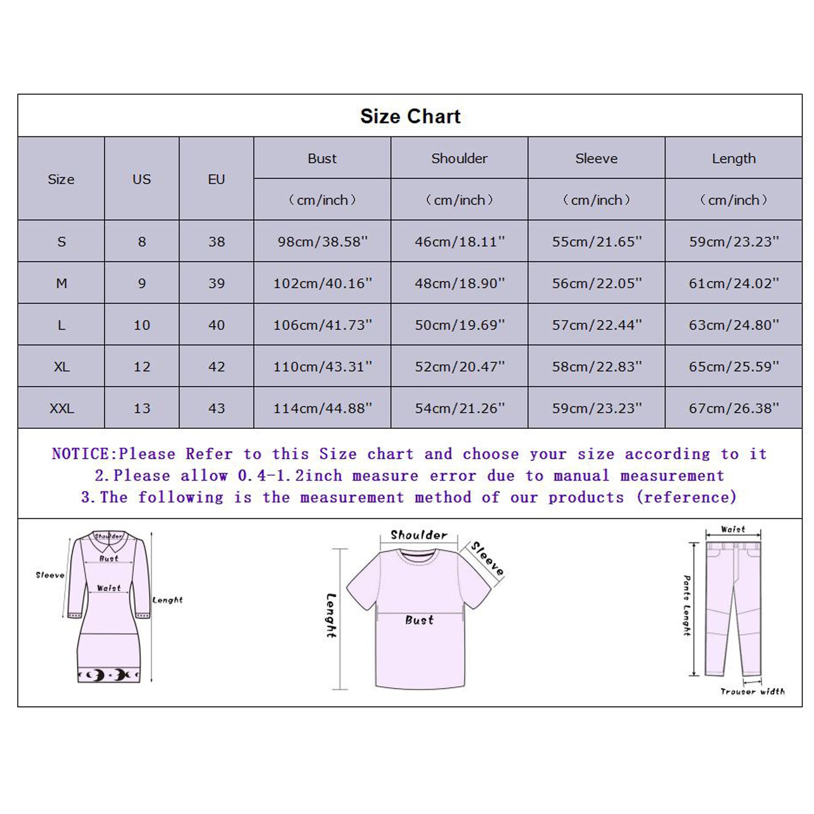 S | 8 | 38 | 98 см/38,58'' | 46 см/18,11'' | 55 см/21,65'' | 59 см/23,23'' |