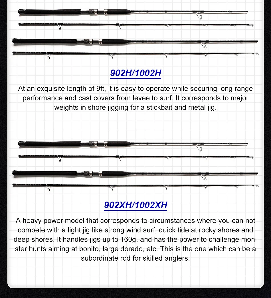 Модель тяжелой мощности, которая соответствует условиям, когда вы не можете конкурировать с джиг-светильник, как сильный ветер серфинга, быстрый прилив на скалистых берегах и глубоких берегах. Он обрабатывает Джиги до 160 г, и имеет возможность бросать вызов охотам монстров, нацеленным на bonito, Big dorado и т. д. это тот, который может быть подчиненным стержнем для квалифицированных рыболовов.