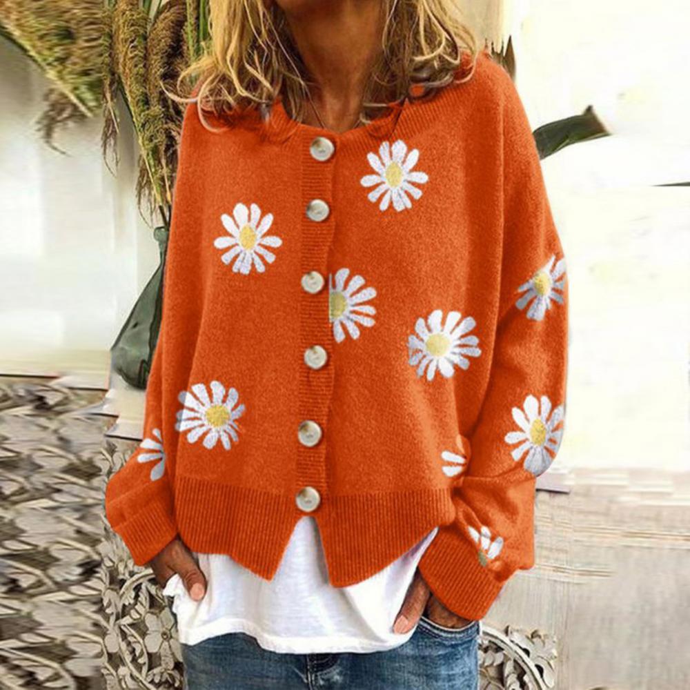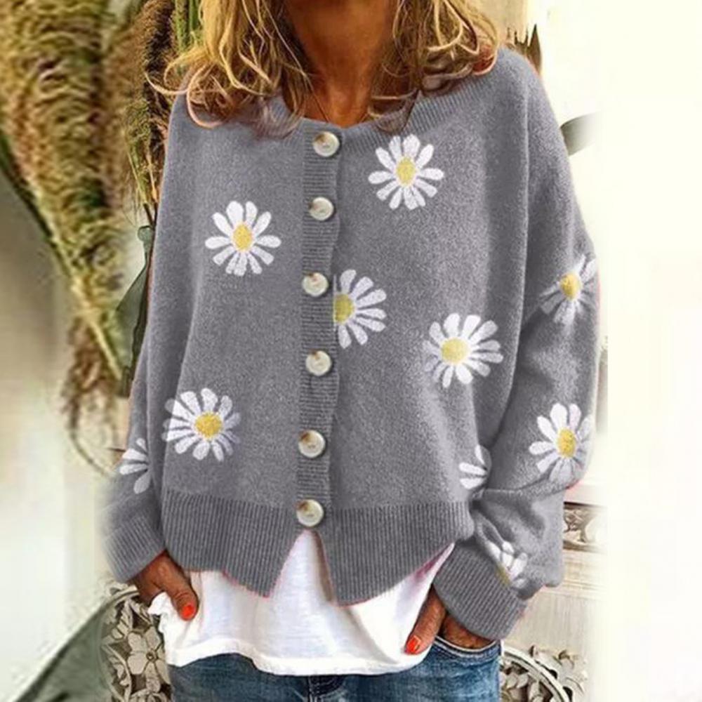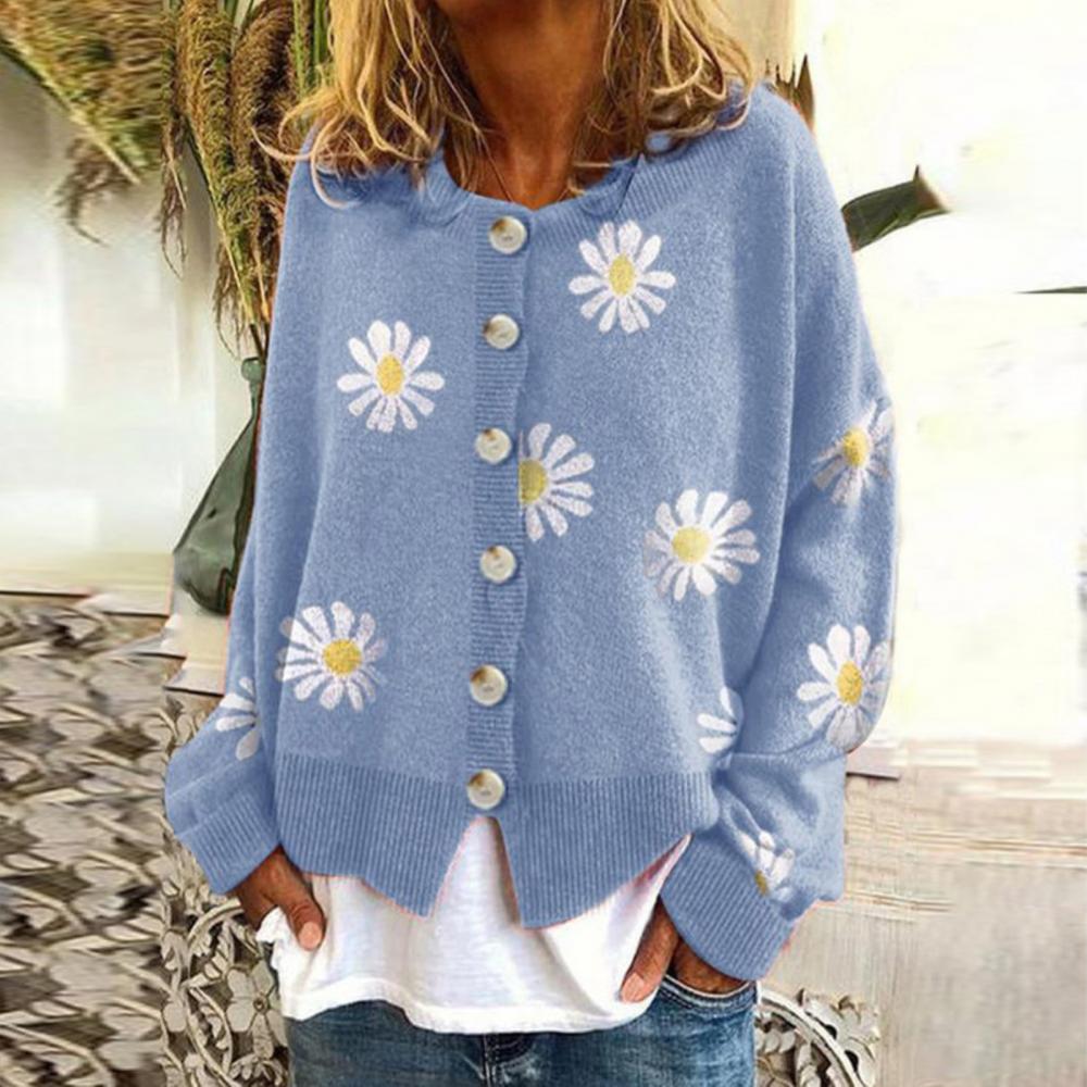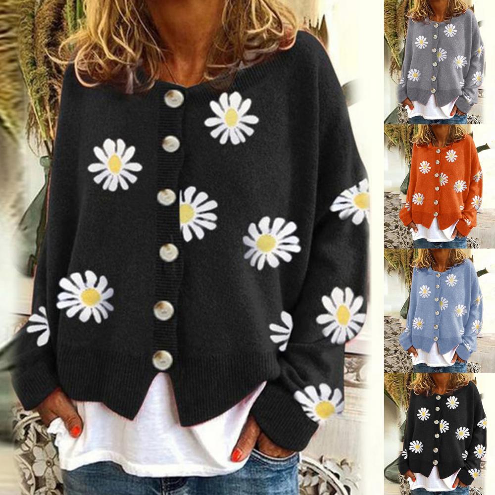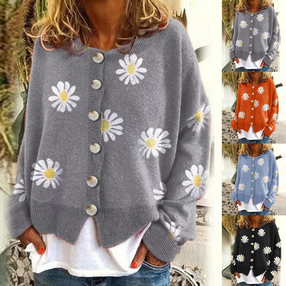 winter Women Long Sleeve Marguerite Print Sweater Cardigan Autumn Knitted Jacket Coat for lady