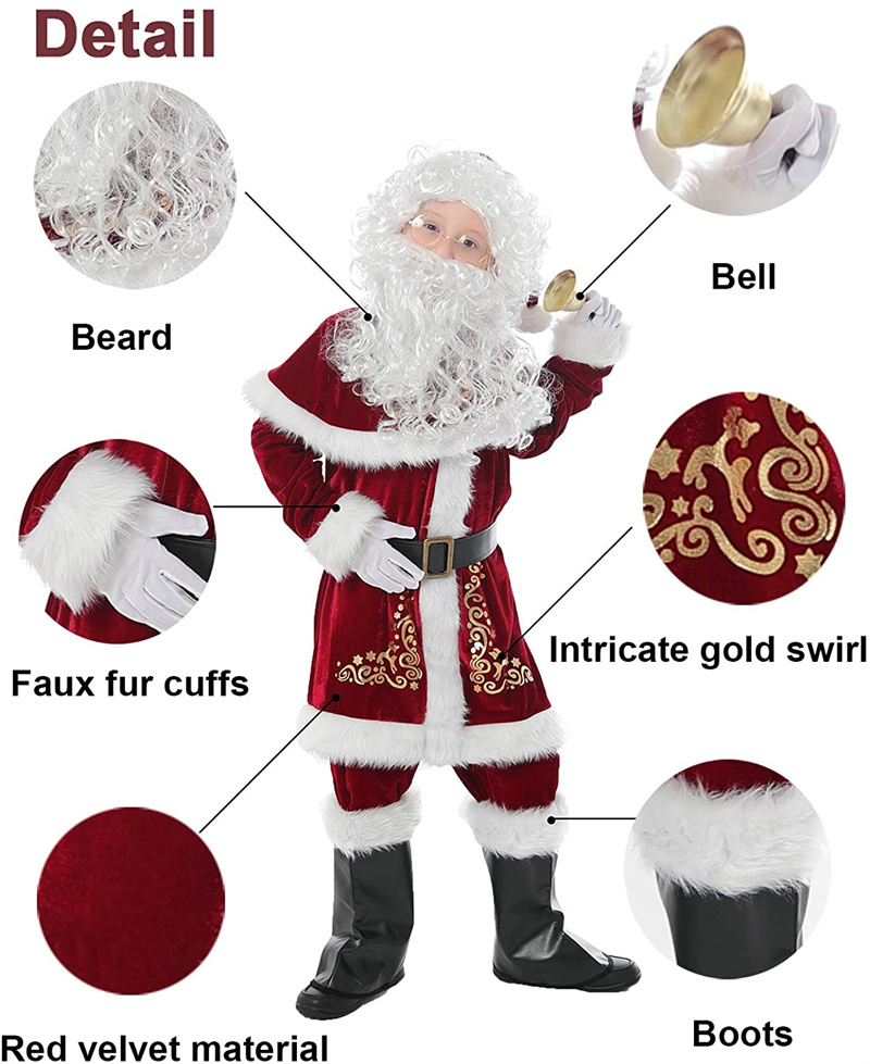 Здравствуйте! Добро пожаловать в наш магазин!Качество на первом месте и самый лучший сервис. Все покупатели — наши друзья.Модный дизайн, 100% новый бренд, высокое качество!Костюм Санта Клауса Детский Рождественский костюм для взрослых красный роскошный бархатный нарядный комплект из 8 предметов8 шт. пальто + шаль + брюки + шапка + ботинок + пояс + перчатки + бородаМатериал: бархатРазмер: S/M/L/XL/XXLНиже приведена таблица размеров костюма Санта-Клауса для взрослых
