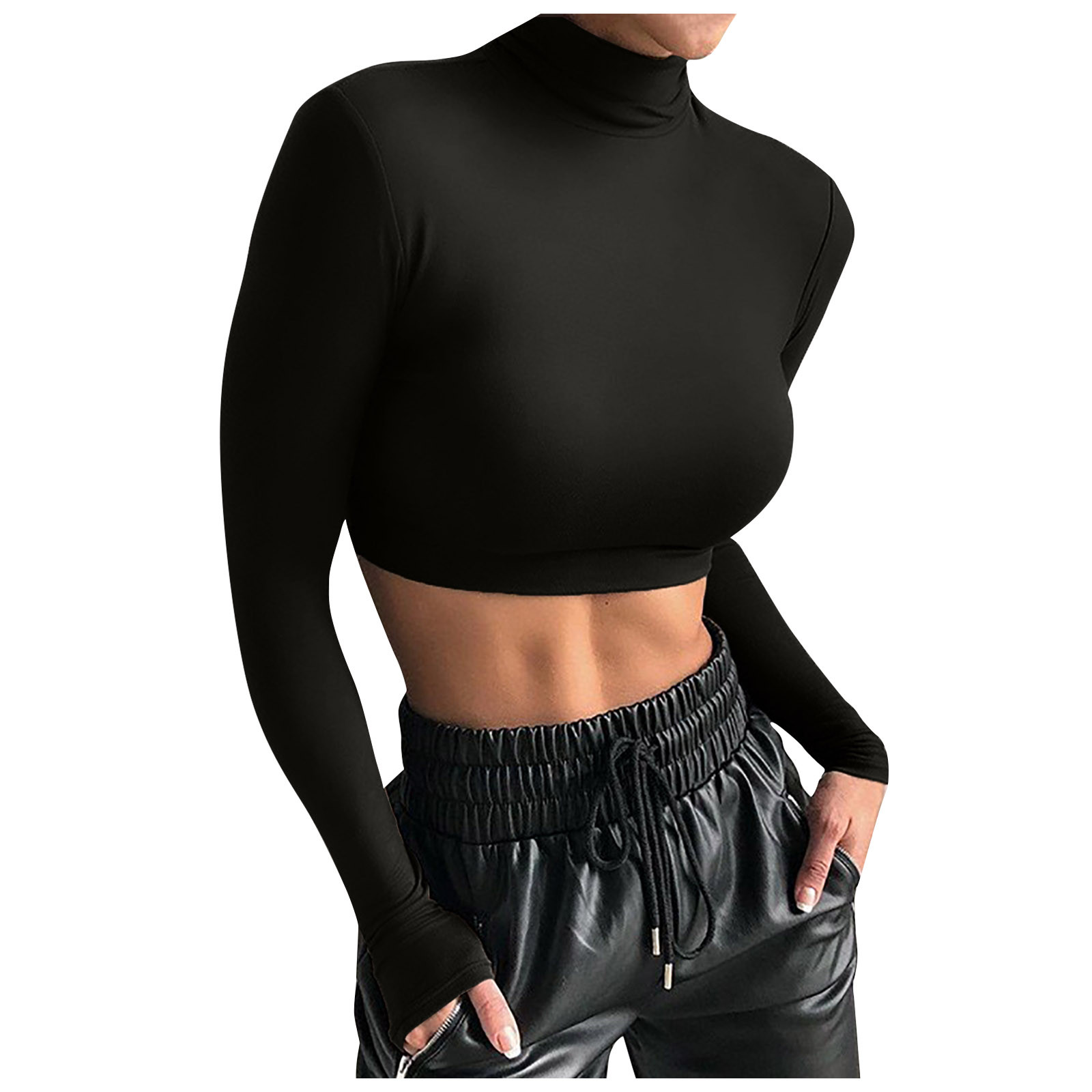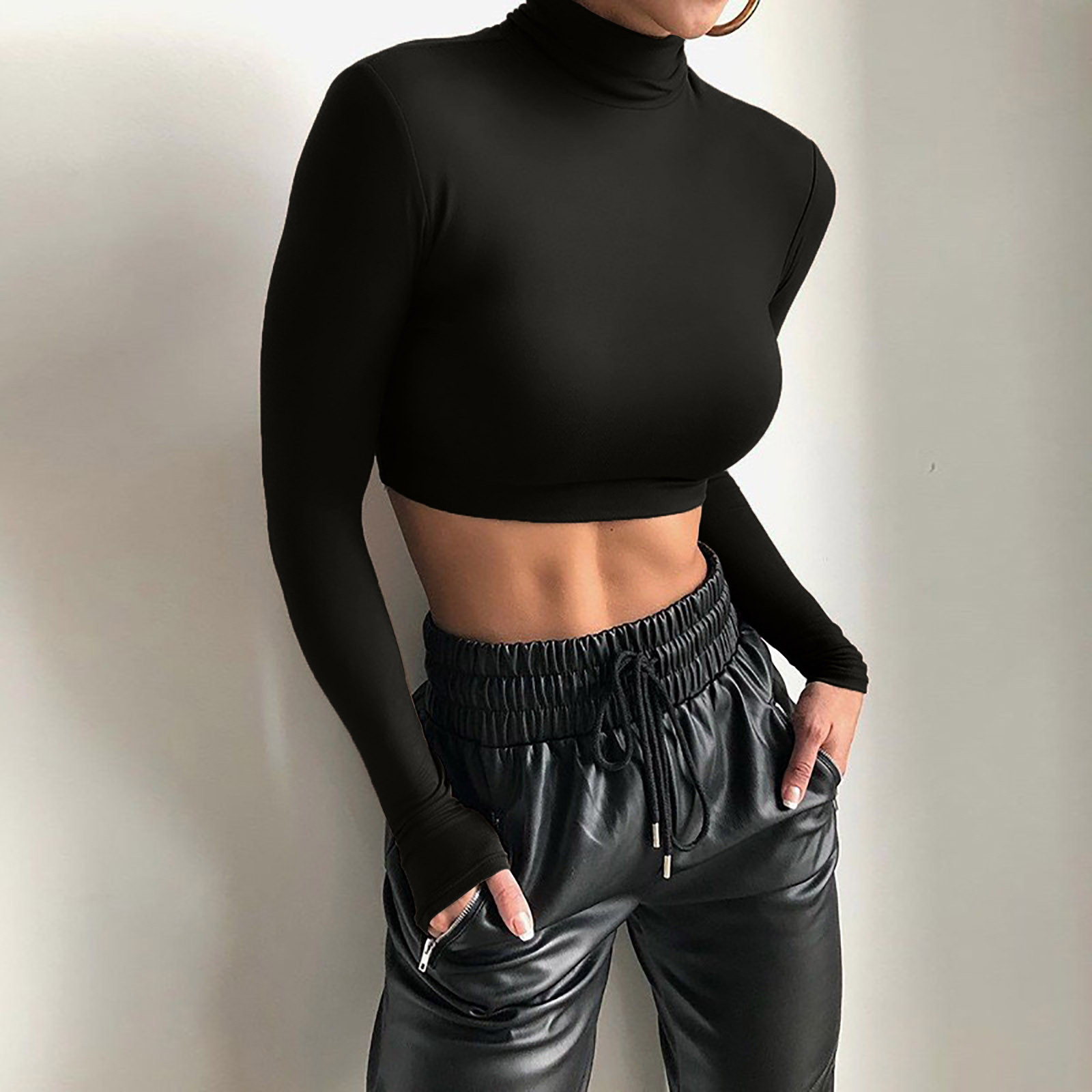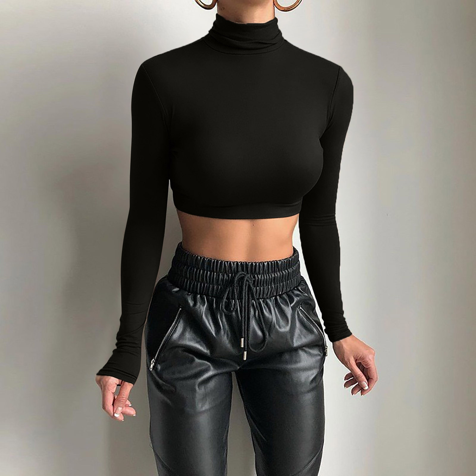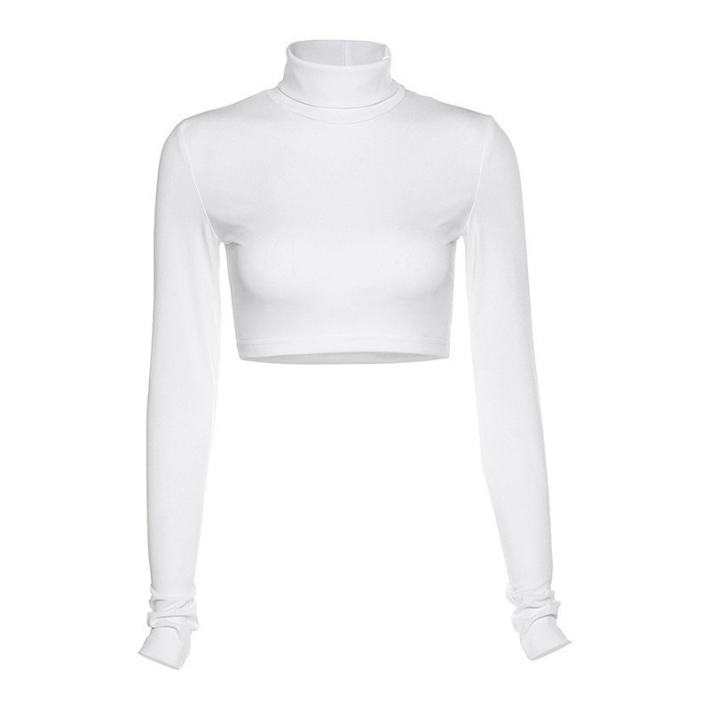 Модный женский тонкий однотонный пуловер с высоким воротом, короткий топ с пупком и длинным рукавом