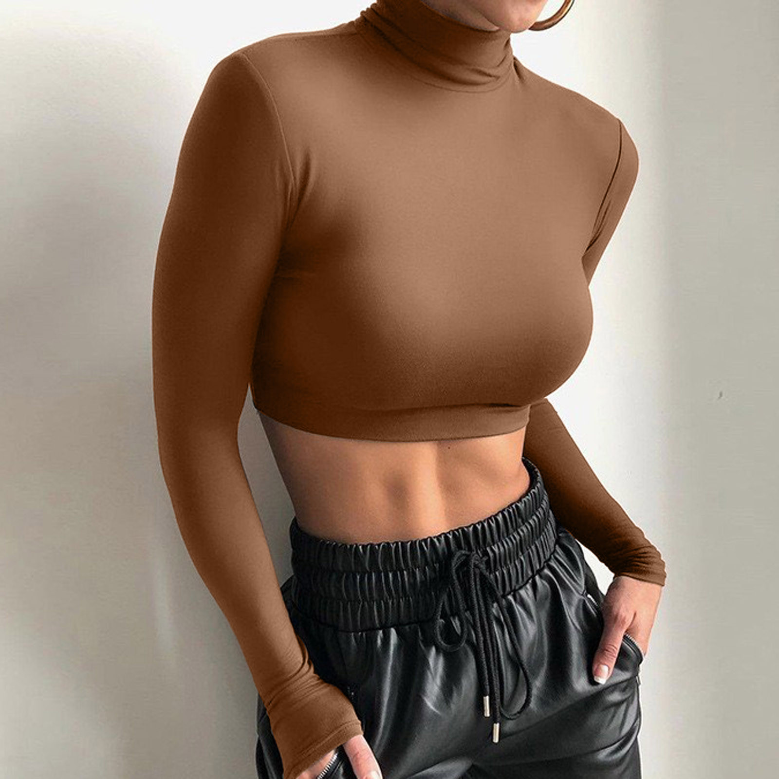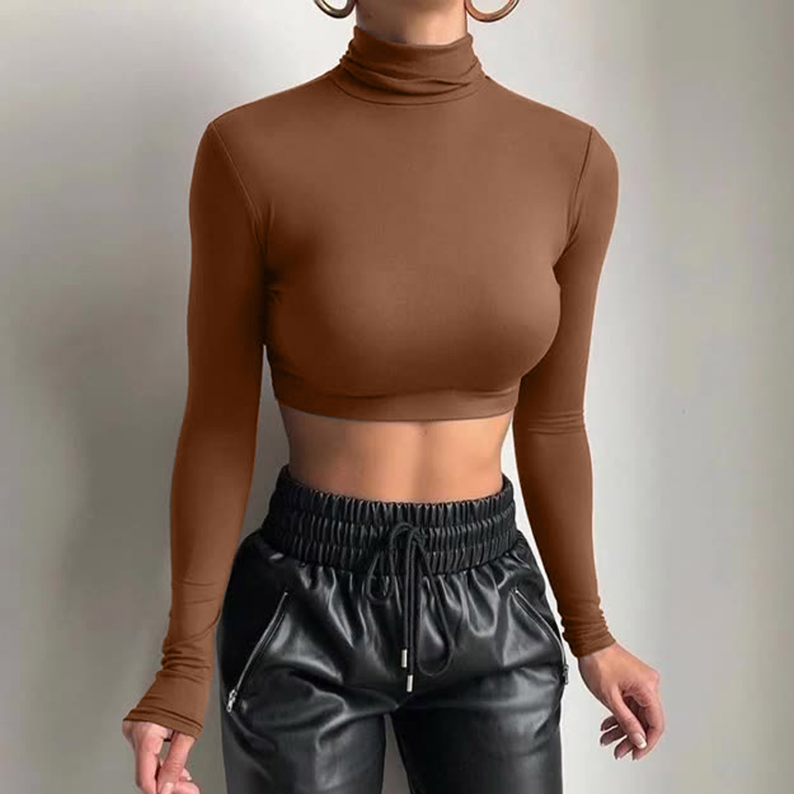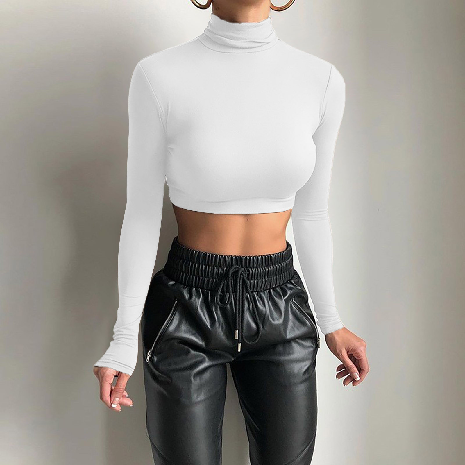 Модный женский тонкий однотонный пуловер с высоким воротом, короткий топ с пупком и длинным рукавом