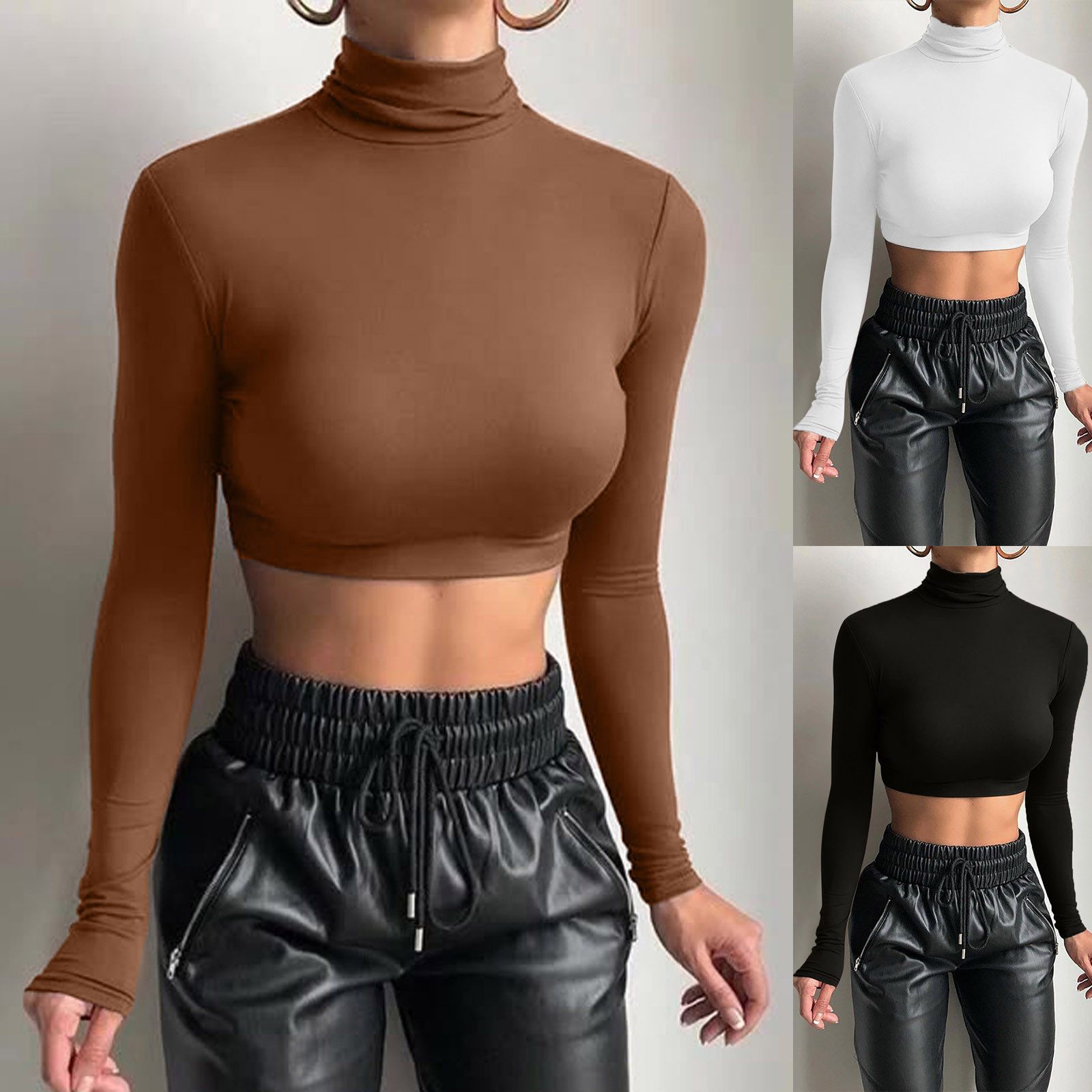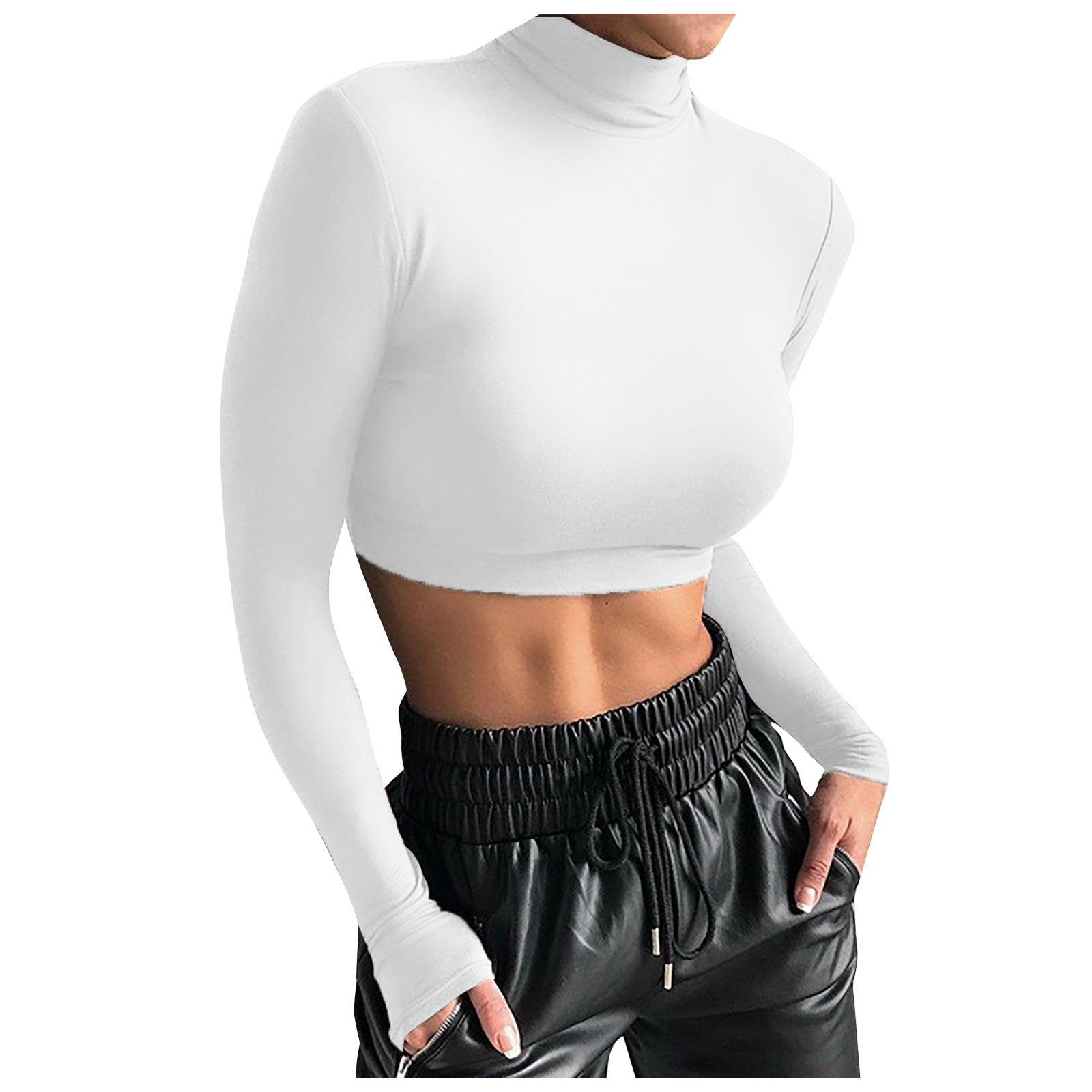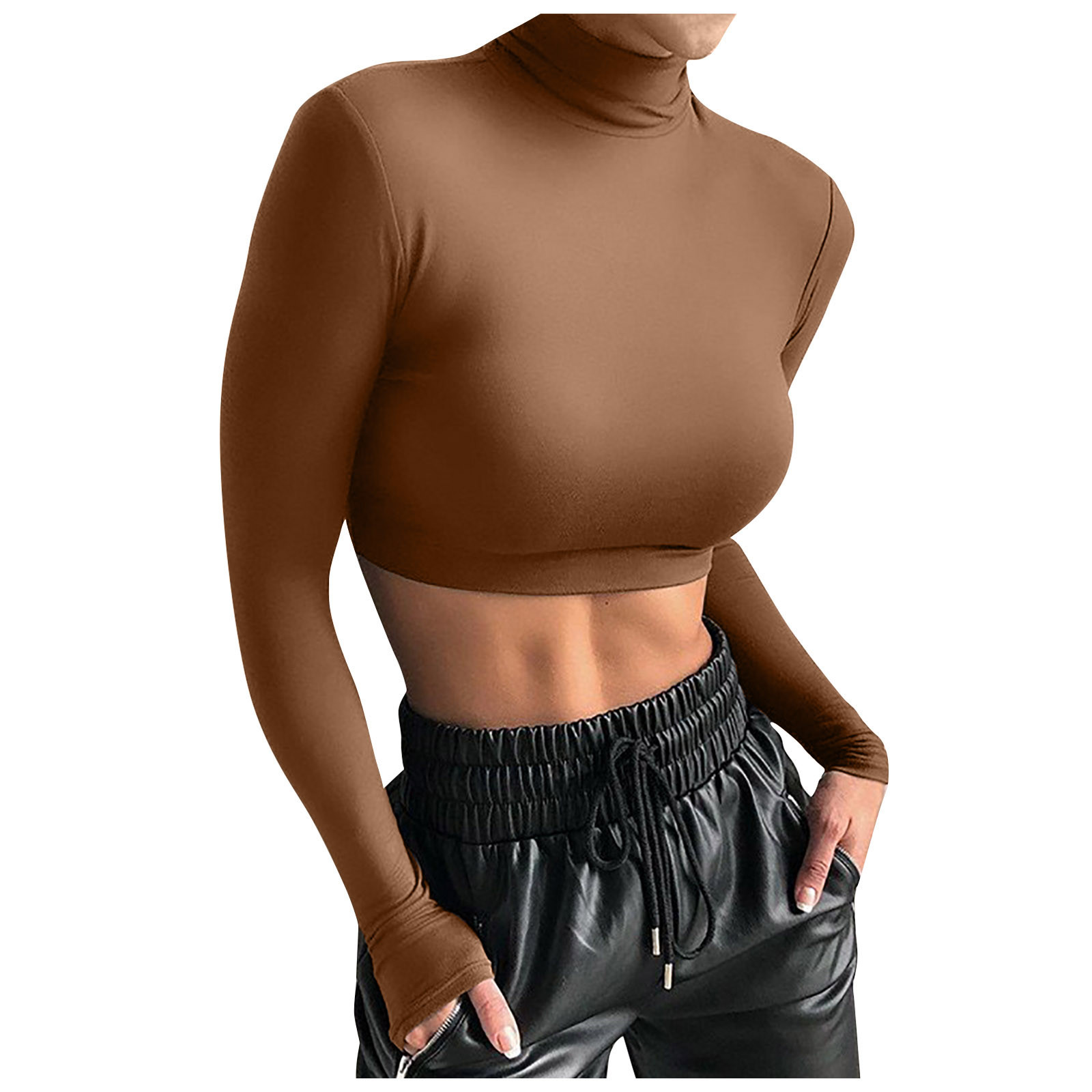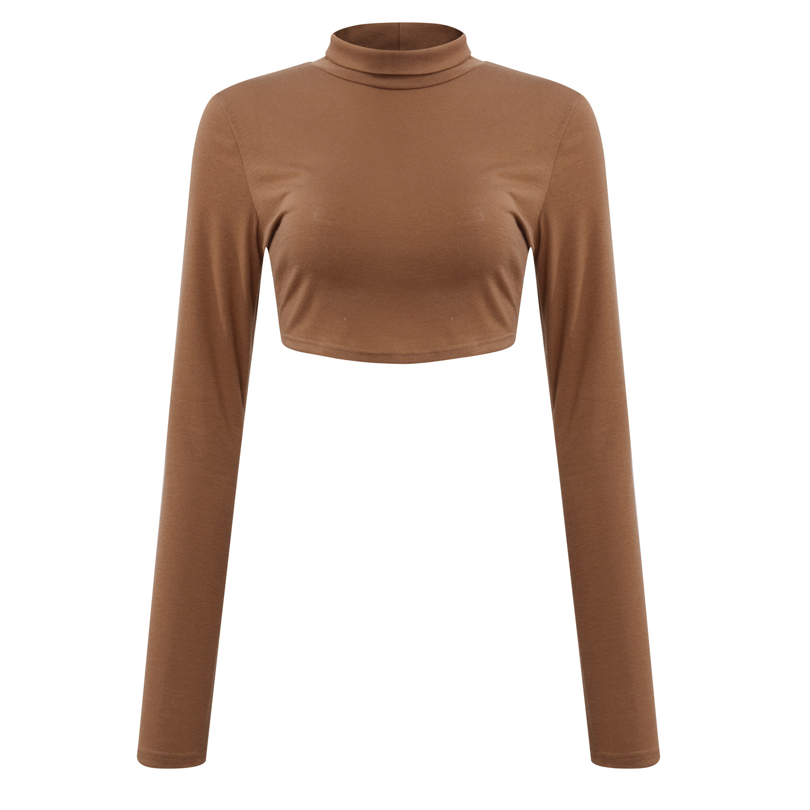 Модный женский тонкий однотонный пуловер с высоким воротом, короткий топ с пупком и длинным рукавом