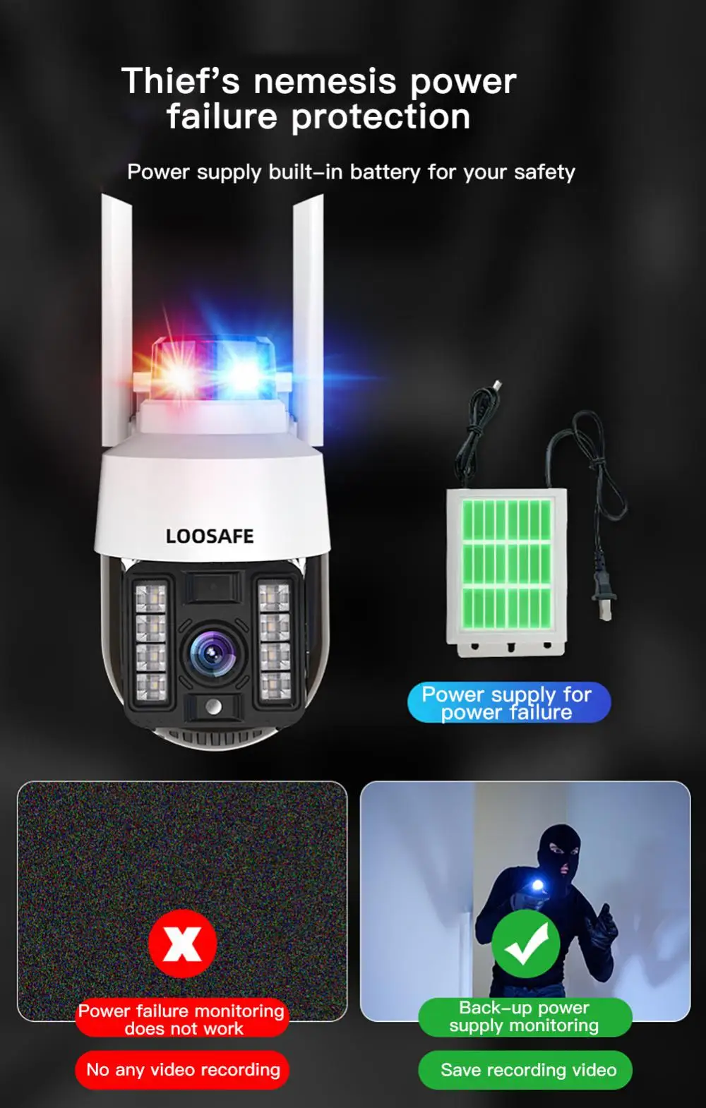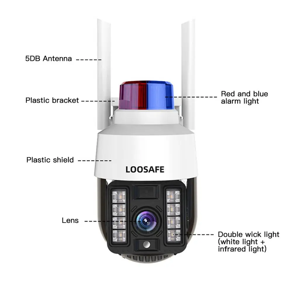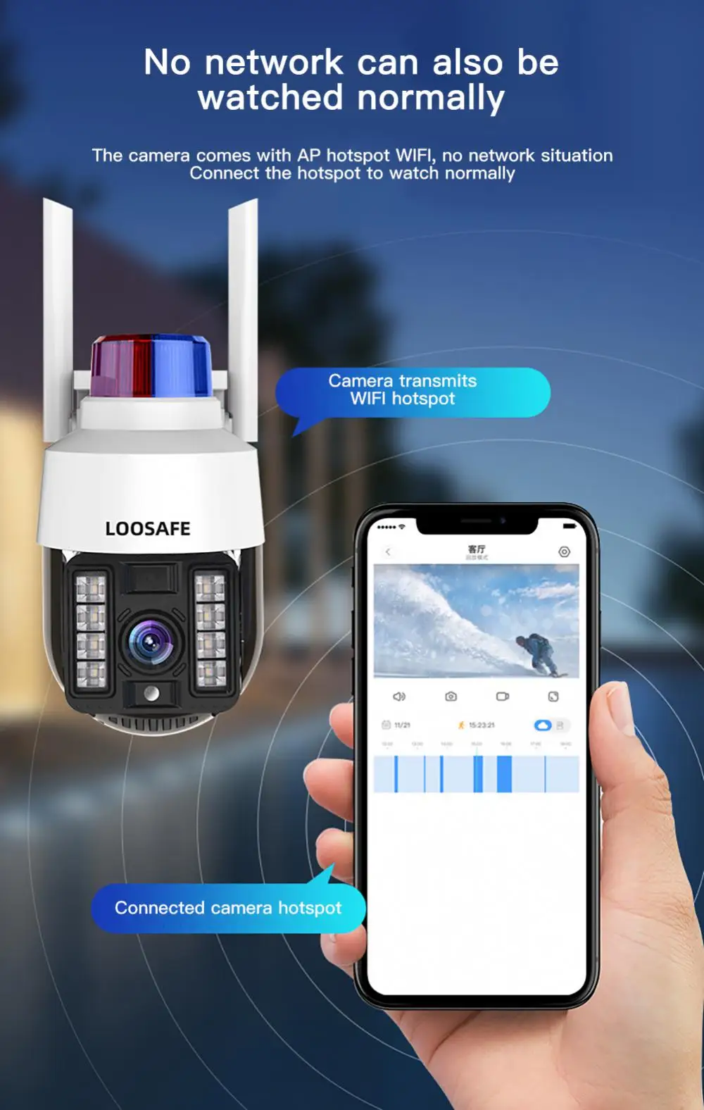 【Красный и синий сигнализация】:Ультра-прозрачное наружное наблюдение, отключение видео, автоматический круиз 360 °, человекоидное отслеживание | Звук и оповещение о светильник