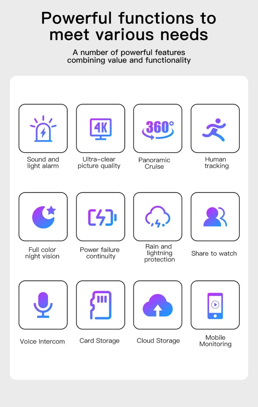 【Особенности 】:Отвечают ряду функций, звуковой сигнал и светильник, ультра-четкое качество изображения, панорамный круиз, гуманоидное отслеживание, полноцветное ночное видение, время автономной работы, защита от дождя и светильник, просмотр, голосовой Интерком, облачное хранилище карт, мобильный телефон, мониторинг