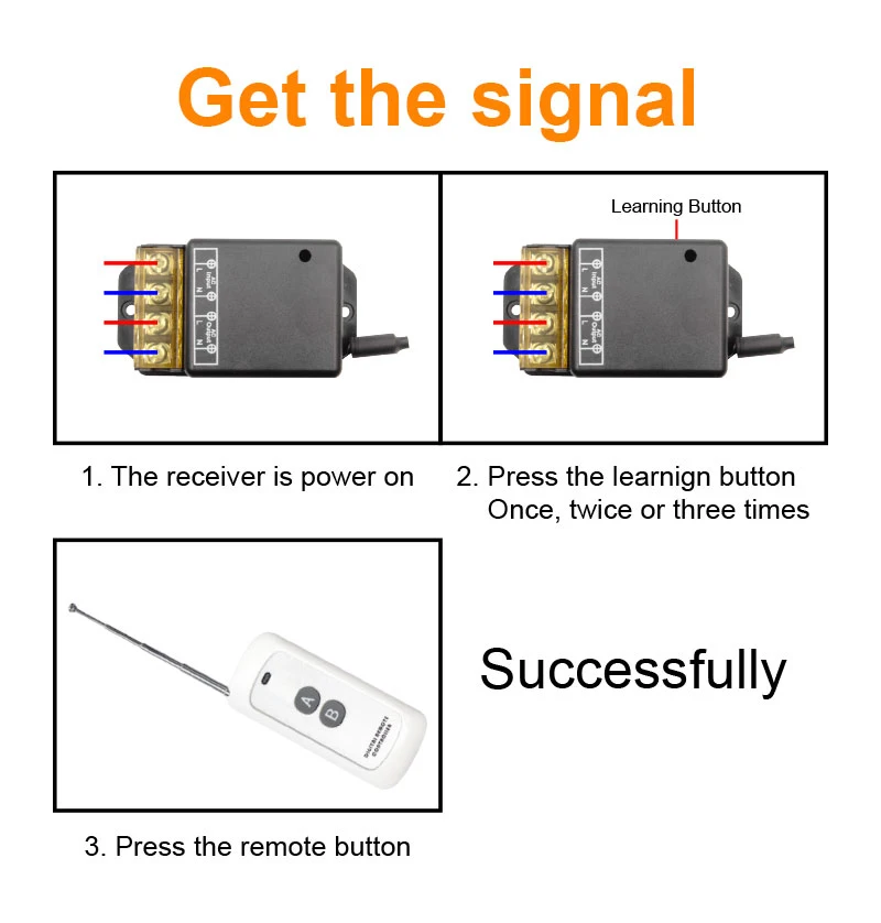 Настройка: в соответствии с изображениями выше, нажмите и отпустите кнопку обучения на приемнике дважды. Подождите немного, затем нажмите одну кнопку на пульте дистанционного управления, светодиодный индикатор на плате приемника включится, затем выключится, указав, что кнопка была изучена.