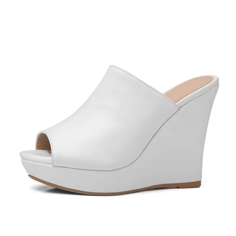Босоножки на танкетке и высоком каблуке; кожаные летние пикантные туфли с открытым носком на высоком каблуке; женские шлепанцы на платформе; модная женская обувь; цвет белый, черный; D048