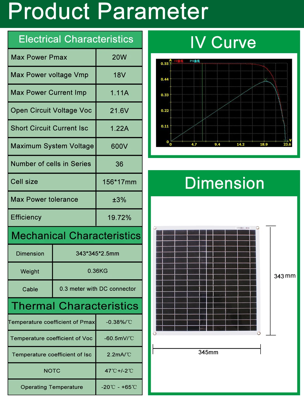 Максимальная мощность Pmax 20 Вт Максимальное напряжение питания Vmp 18V Максимальная сила тока Imp 1.1A Напряжение открытого замыкания Voc 21,6 V Ток короткого замыкания Isc 1.3A Максимальное напряжение системы 600 в Количество ячеек в серии 36 Максимальная допустимая мощность ± 3%