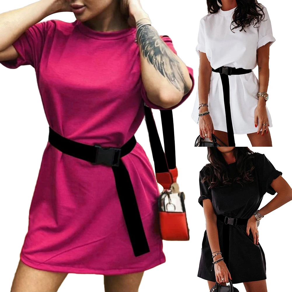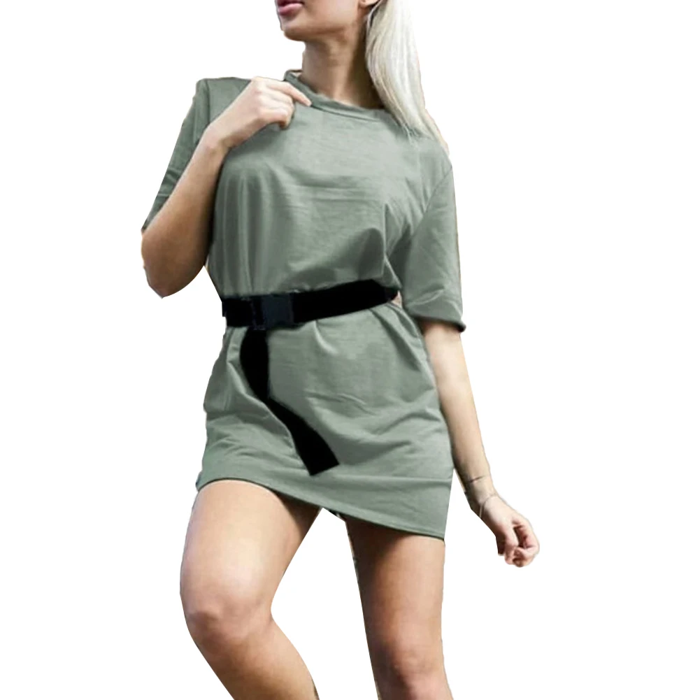 Женская Однотонная футболка с круглым вырезом и коротким рукавом, с поясом, для домашнего отдыха, мини свободное платье