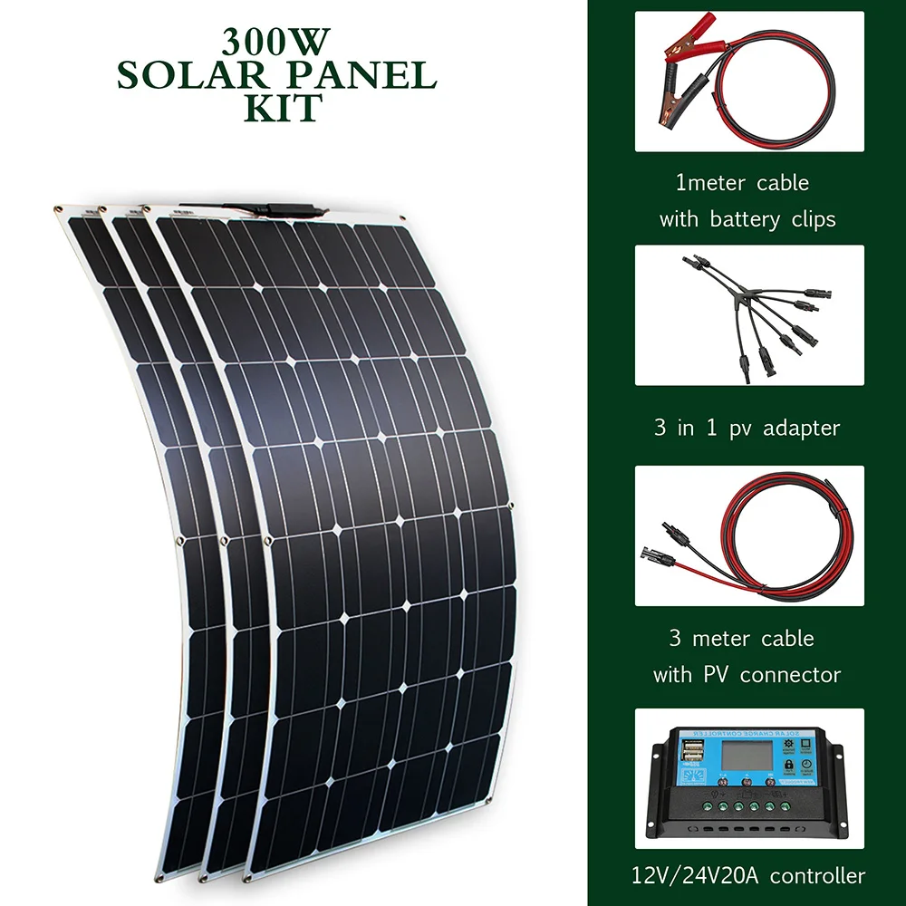 B. 100 Вт Гибкая солнечная панель * 3 12v/24v 20A Солнечный контроллер * 1 Кабель с солнечным контроллером * 1 Кабель с зарядным устройством * 1 3 в 1 переходник для солнечных батарейЭлектрические характеристики